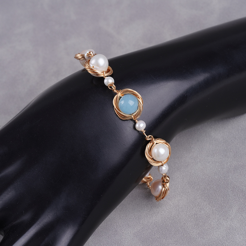 สร้อยข้อมือไข่มุกน้ำจืดธรรมชาติสีน้ำทะเลหยกสีน้ำทะเลห่อทองคำ 14k ทำมือ